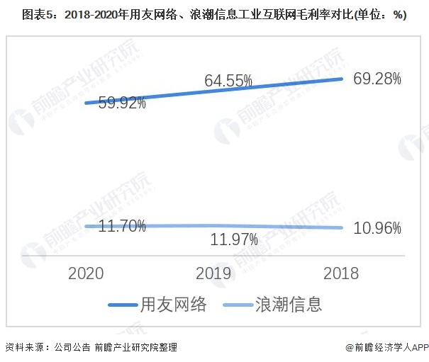 从工业互联网业务的毛利率来看,2018-2020年,用友网络的工业互联网业务毛利率均高于浪潮信息;从毛利率变化趋势来看,浪潮信息的工业互联网业务毛利率总体稳定,而用友网络的毛利率有明显下降。2020年,两家龙头工业互联网企业的工业互联网业务毛利率差距较2018年有所缩小。用友网络毛利率为59.92%,浪潮信息毛利率为11.70%,二者差距高达40%以上。