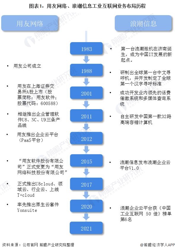 目前,中国工业互联网行业领军企业分别是用友网络、浪潮信息,两家企业在工业互联网业务上的布局历程如下: