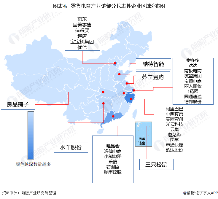 下图选取了我国零售电商产业链中中游环节的零售电商服务商的主要活跃企业,从区域分布情况来看,我国零售电商企业主要分布在北京、上海、浙江省和广东省;这四个地区的经济较为发达,且大数据和互联网发展也较为领先。