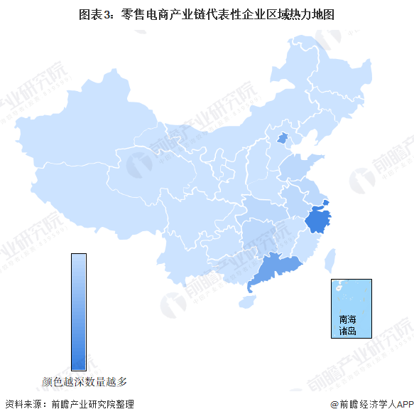 零售电商产业链区域热力图:北京、上海、广州、浙江企业密度最高