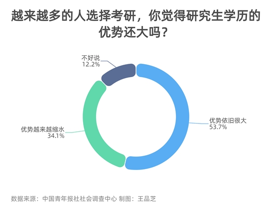 越来越多的人选择考研,53.7%的受访者觉得研究生学历的优势依旧很大,34.1%的受访者觉得优势越来越缩水,12.2%的受访者表示不好说。