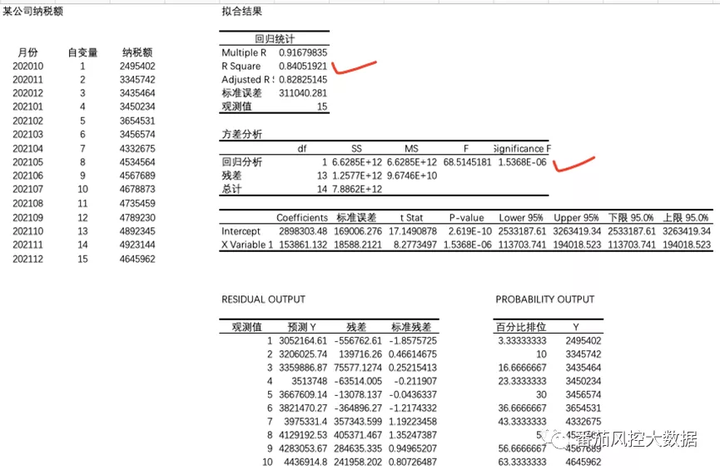 3)第三步,对于求回归时残差超过一定阀值的企业,说明历史缴纳税额非常不稳定,可以对它的纳税金额进行一定的系数扣减;对于残差符合业务逻辑的企业,在预测纳税金额的基础上,结合行业进行一定的系数提升,最终得到预测营业收入。