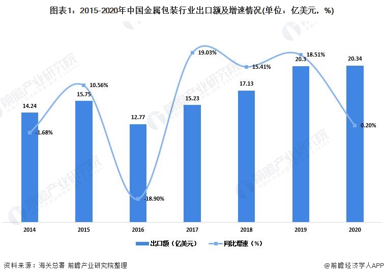 近年来,随着我国对外贸易规模的不断扩大,金属包装行业出口市场规模不断增长。根据海关总署数据显示,2020年我国金属包装行业累计完成出口额20.34亿美元,同比增长0.20%,受新冠疫情影响,出口额增速较2019年大幅下降。