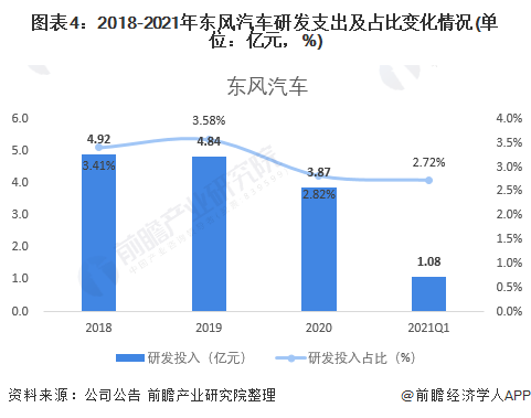 2018-2020年,东风汽车的研发支出和占比波动下降。其中2020年东风汽车的研发投入达到3.87亿元,占当年营业收入的2.82%。下降的主要原因是受到疫情的负面影响。