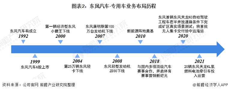 1992年,东风汽车成立;1999年,东风汽车A股上市;2000年以后,东风汽车开展了卡车和货车的相关业务;2010年,东风汽车的新能源阵地成功奠基,从此,东风汽车开始开展新能源专用车业务;2020年,东风汽车开展自动驾驶专用车业务,并进行了首批专用车的交付;专用车业务达到新的高度。