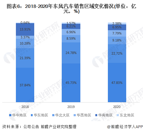 2018-2020年,东风汽车的主要销售区域为华中地区和华东地区。相较于2018年和2019年,华南地区2020年的销售额出现明显下降,相应地,华北和华西地区的销售额有所上升。因此,东风汽车的主要销售区域仍然以中国东中部经济相对发达地区为主。未来,东风汽车可以考虑进行下沉市场,随着基础设施的建设辐射至中西部地区,东风汽车可以进行二三线城市的布局。