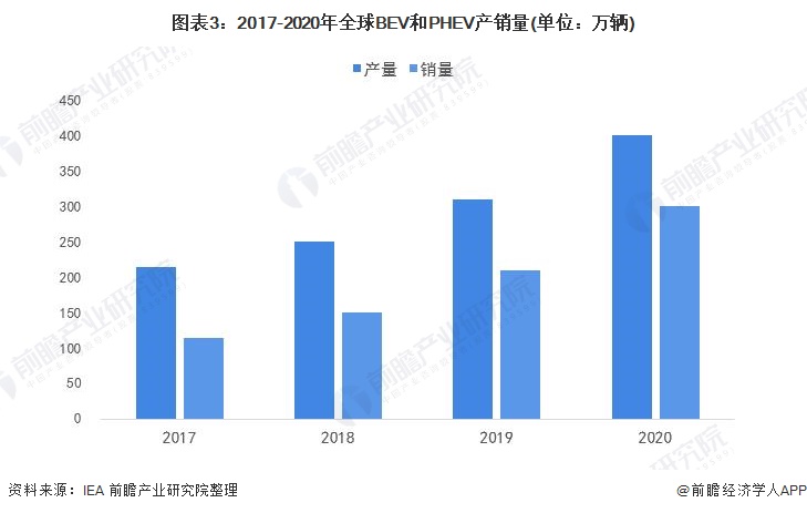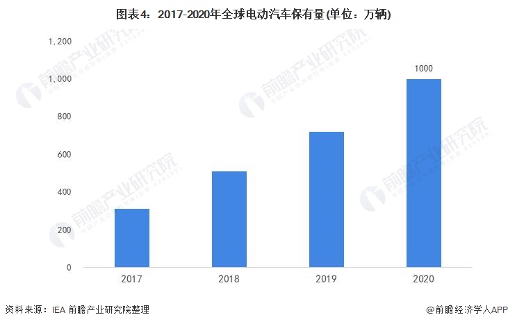 2020年,在全球汽车销售低迷情况下,全球BEC和PHEV销量逆势上涨,达约300万辆。与此同时,2017-2020年全球电动汽车保有量呈上升趋势。2020年,全球电动汽车保有量约为1000万辆。