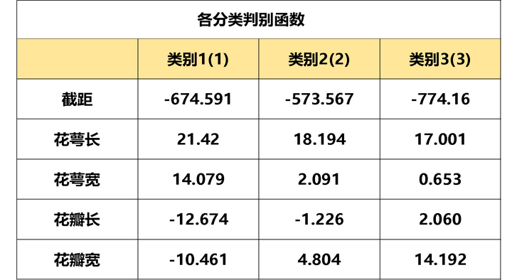 - 类别2 = -573.567 + 18.194花萼长 + 2.091花萼宽-1.226花瓣长 + 4.804花瓣宽