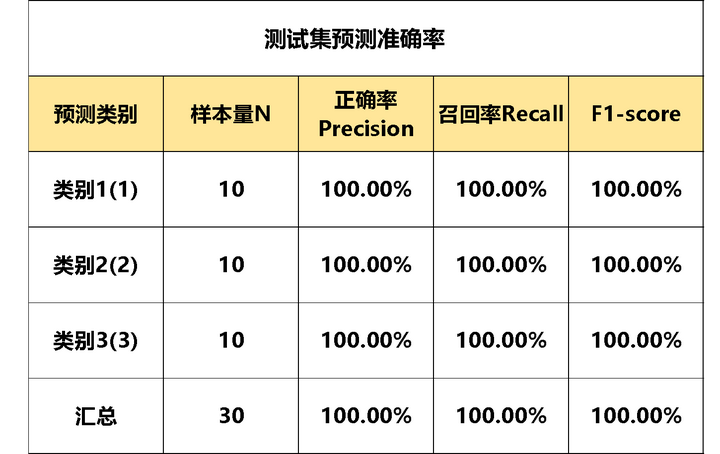 上表展示测试集即30个样本数据的预测准确率;上表显示整体正确率为100%。也即说明测试集显示数据全部预测准确,没有预测出错的现象。模型拟合质量非常高。