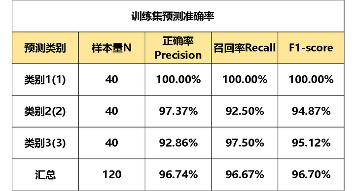 上表显示,三类的预测准确率均超过90%,说明训练集有很高的预测准确率。
