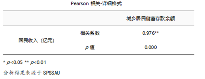 - 从上表可知,利用相关分析去研究城乡居民储蓄存款余额分别和国民收入(亿元)共1项之间的相关关系,使用Pearson相关系数去表示相关关系的强弱情况。具体分析可知:城乡居民储蓄存款余额和国民收入(亿元)之间的相关系数值为0.976,并且呈现出0.01水平的显著性,因而说明城乡居民储蓄存款余额和国民收入(亿元)之间有着显著的正相关关系。