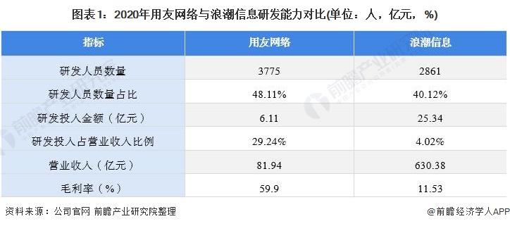 目前国内工业互联网领先企业有用友网络、东方国信、启明星辰、浪潮信息等。其中用友网络与浪潮信息处于领先地位。从研发能力来看,用友网络从研发人员数量上具有优势,而研发投入金额上浪潮信息略胜一筹。从经营能力上看,浪潮信息营业收入大幅超过用友网络,而用友网络毛利率显著高于浪潮。