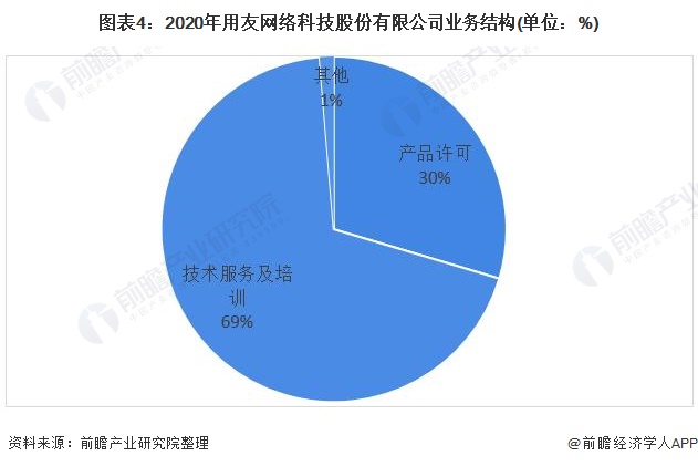 2020年,用友网络产品许可业务实现营收24.26亿元,技术服务及培训业务实现营收56.60亿元,分别占比30%、69%。