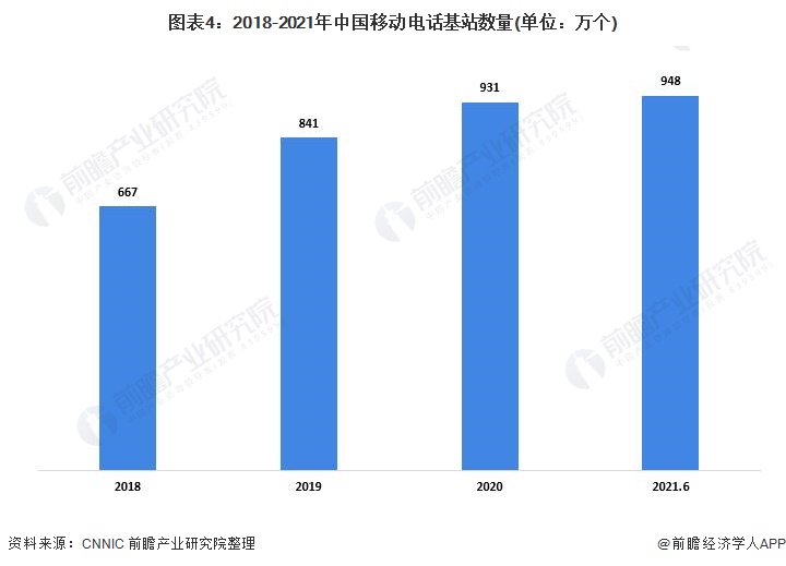 截至2021年6月,移动电话基站总数达948万个,较2020年12月净增17万个。其中,5G基站总数96.1万个,其中2021年上半年新建19万个。