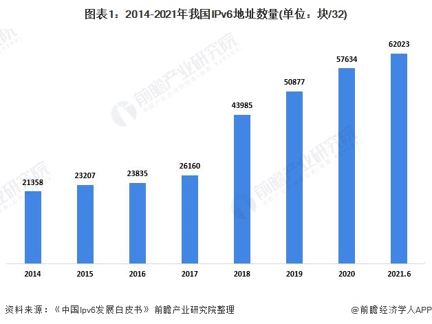 近年来,我国IPv6地址数量增长迅速。截至2021年6月,我国IPv6地址数量为62023块/32,较2020年12月底增长7.6%。