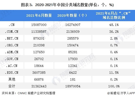 截至2021年6月,我国域名总数为3136万个,较2020年底总数增长超过60%。其中,“.CN”域名数量为1509万个,占我国域名总数的48.1%;“.COM”域名数量为1134万个,占我国域名总数的36.2%。