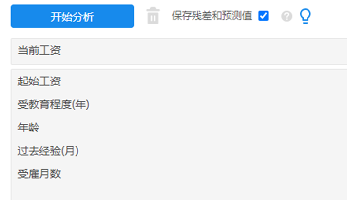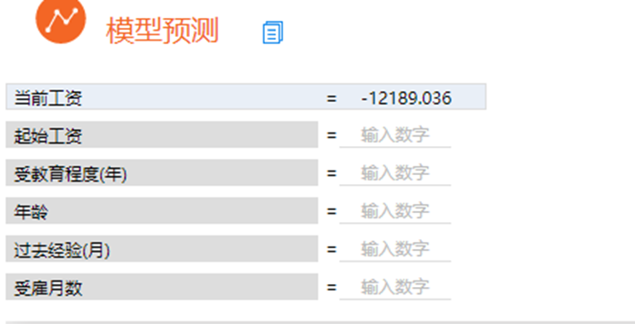 (6)总结分析可知:起始工资, 受教育程度(年), 受雇月数会对当前工资产生显著的正向影响关系。以及年龄会对当前工资产生显著的负向影响关系。但是过去经验(月)并不会对当前工资产生影响关系。 - 此外SPSSAU还会提供智能模型预测(输入数字即可):