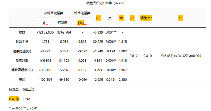 (5)受雇月数的回归系数值为166.606(t=4.843,p=0.000<0.01),意味着受雇月数会对当前工资产生显著的正向影响关系。