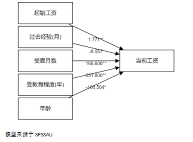 (1)起始工资的回归系数值为1.771(t=30.229,p=0.000<0.01),意味着起始工资会对当前工资产生显著的正向影响关系。