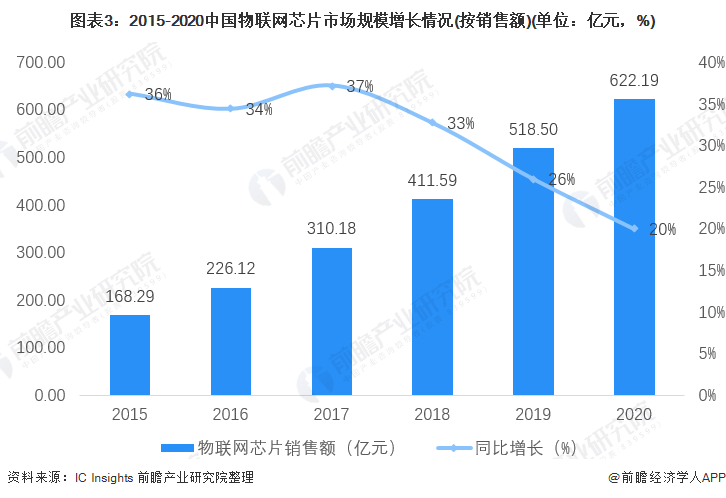 芯片作为连接物联网的核心设备,在物联网中的所有应用中也处于核心地位。从物联网芯片的市场来看,根据IC Insight机构统计,全球2020年物联网芯片市场规模约为311亿美元,同比增长10%;而中国物联网芯片市场在2020年约为622亿元,同比增长率达到了20%,随着近几年来中国物联网的发展,物联网技术的快速普及正在深刻影响着家居、工业、医疗、交通等众多应用层领域,并带动了物联网芯片的需求。