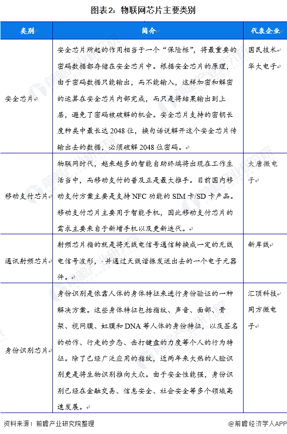 芯片作为连接物联网的核心设备,在物联网中的所有应用中也处于核心地位。目前,我国物联网芯片产业主要包括:安全芯片、移动支付芯片、通讯射频芯片和身份识别类芯片等。