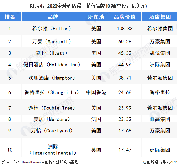 根据英国品牌评估机构“品牌金融”(BrandFinance)发布的2020年度“全球最有价值的50个酒店品牌”榜(BrandFinanceHotels502020),美国酒店管理集团包揽前三位,分别为希尔顿、万豪和凯悦。总部在中国香港的香格里拉名列第六位,中国大陆本土品牌只有锦江和汉庭上榜。其中美国万豪、凯悦均有精品酒店的业务,表现较好。主要榜单如下: