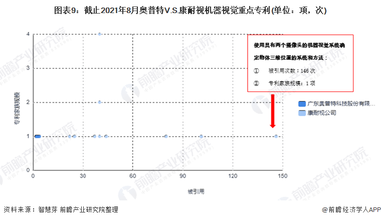 在重点专利布局上,康耐视重点布局的专利为“使用具有两个摄像头的机器视觉系统在三个维度上确定物体位置的系统和方法”,该项专利被引用次数146次,专利家族规模为1项。奥普特重点布局的专利为“一种高倍率大靶面高解析度线扫机器视觉镜头”,该项专利被引用次数4次,专利家族规模为1项。整体来看,康耐视重点布局的专利无论是在专利被引用次数还是专利家族规模均较奥普特多。