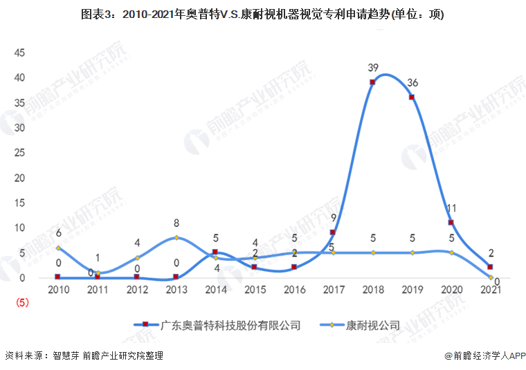 2020年,康耐视机器视觉专利申请量为5项,奥普特机器视觉专利申请量为11项。