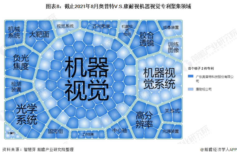 从机器视觉专利聚焦的领域看,目前康耐视的机器视觉系统专利聚焦领域较明显,其余主要聚焦于视觉系统、训练图像、成像装置等。奥普特专利领域交广,遍布于机器视觉、光学系统、争光角度、胶合透镜、机械系统等。