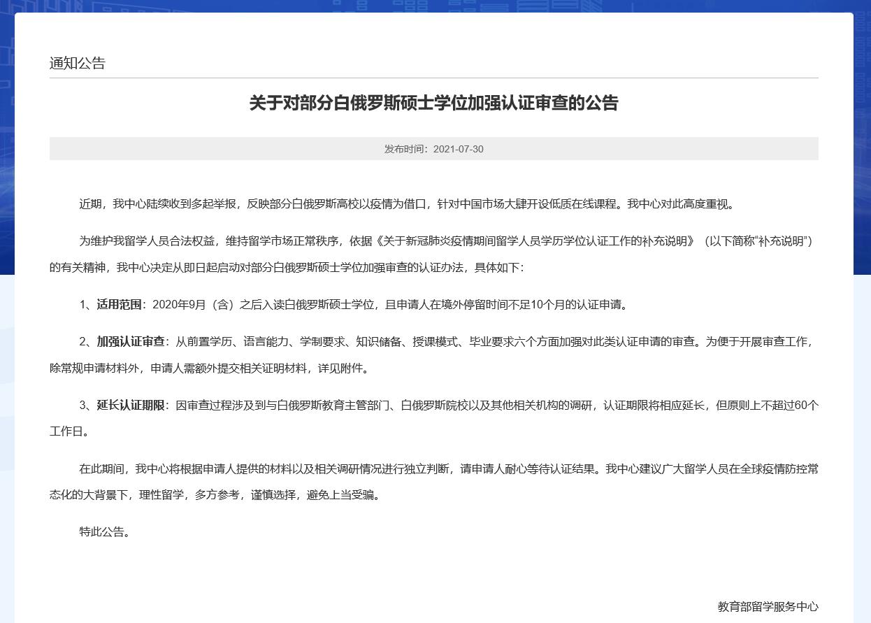 这就是我开篇提到的,中留服频繁点名的原因。从2021年7月开始,留服发布第一个“点名”通知,对所有白俄罗斯的留学生加强认证审核,之后中留服持续发布通知,点名大量的国际院校,理由都是“涉嫌在新冠肺炎疫情期间,针对我国市场突击扩大招生规模,通过在线方式大量输出低质课程”。甚至有些院校,还要面临认证书被追回的情况。“为确保认证工作的严肃性,维护国内学历学位制度,我中心经研究决定不再受理此类项目的认证申请,同时对先前已出具认证书的申请案例发起复核,并根据复核结果做出相应处理决定。”