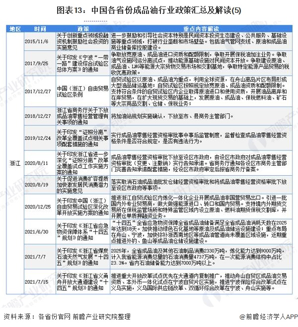 我国的成品油行业各省政策主要依照国家政策为主,因地制宜实施。其中山东因为产能过剩严重,技术落后且产能小的地炼企业较多,所以政策主要以整合炼化产能,提升油品质量、保障成品油储运为主。而浙江作为经济先行试验集中地,在舟山、宁波等地区开展自由贸易试验区,所以政策主要以成品油的市场化探索为主,制定油品国际贸易与期货交易。