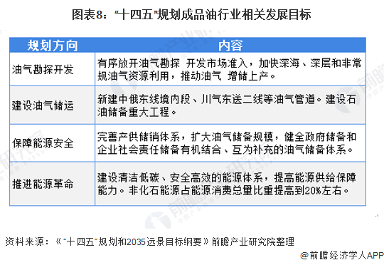 成品油作为原油炼化的主要产品,同时也是我国能源消费的重要组成,其上游和下游领域都将对行业产生重要影响。从我国“十四五”规划的发展方向看出,我国将会逐步减少对于化石能源的依赖,加快低碳、新型能源的建设。同时,为了保障能源安全,我国将继续大力发展油气勘探工作,完善油气的储运以及产销系统。