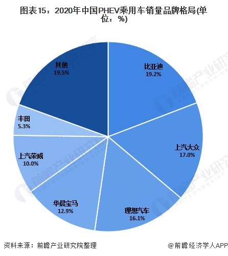 从品牌格局来看,根据对全国PHEV乘用车交强险上险量的数据统计,我国PHEV市场主要被比亚迪、大众、理想、宝马和荣威占据。其中,比亚迪2020年占比达到了19.2%,排名第一。