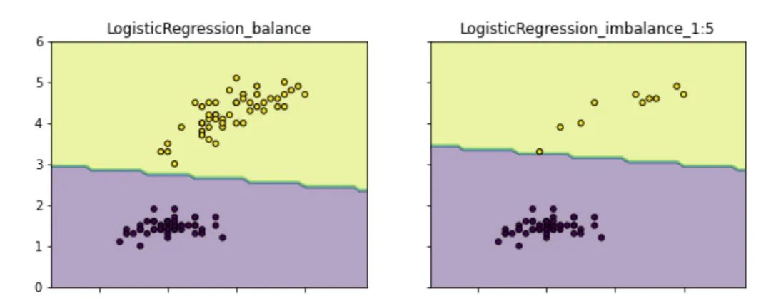 如下图(示例代码请见:github.com/aialgorithm),类别不均衡情况下的分类边界会偏向“侵占”少数类的区域。更重要的一点,这会影响模型学习更本质的特征,影响模型的鲁棒性。