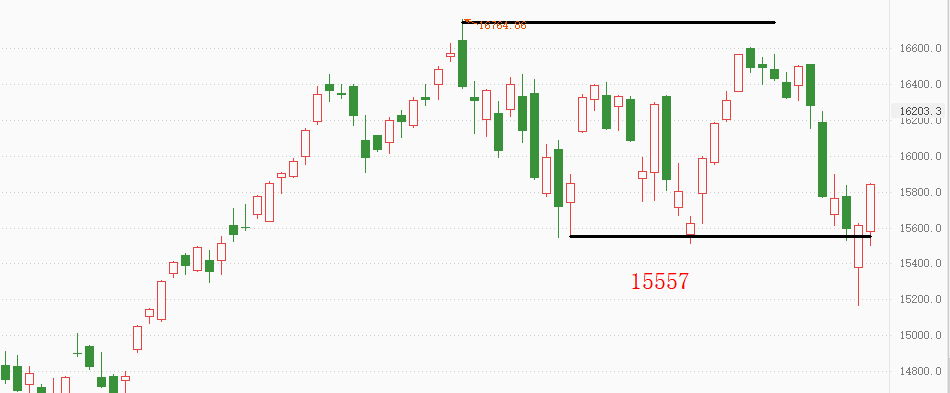 纳指数十年长牛的趋势不容忽视,从技术走势看,本轮上涨破前高后再扩大战果的可能性极高。图中震荡区间内存在三轮下跌波段,它们都是由于美联储关于Taper鹰派发言后市场情绪暂时性悲观导致的。前天盘中K线一度收阴,看起来要形成对15557的有效突破,然而在美东时间的下午时段,纳指强势上涨,最终以中阳线收盘。昨天纳指延续强势,涨幅达1.47%,上攻态势良好。今日亚盘时段,日本225指数上涨1.92%,韩国指数上涨1.54%,澳大利亚指数上涨0.67%,沪深300上涨1%,由此可见,市场情绪乐观,美盘时段的纳指预计还将延续涨势。