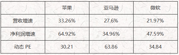 纳指前三大高市值公司分别为:苹果(AAPL)、亚马逊(AMZN)、微软(MSFT),这三支个股的基本面数据对纳指走势影响最大。营收增速方面,三支个股最低为21.97%,最高为33.26%,表现良好;净利润增速方面,三支个股最低34.96%,最高64.92%,表现极好;动态PE方面,最低值34.84,最高值63.86,估值偏高。综合来看,纳指成分股业绩表现相当良好,内在价值快速增长,对股价的支撑作用极大。高估值的问题确实需要关注,但以当前的营收和净利润增速来看,最高63.86的PE并不过分。