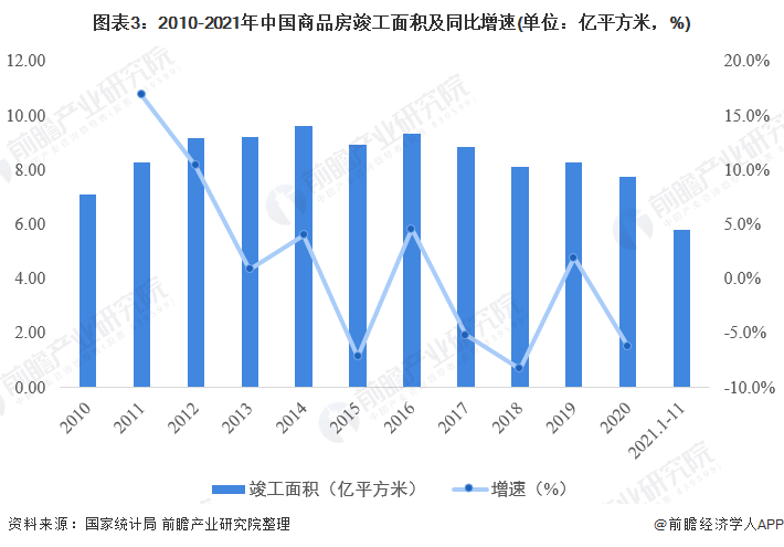 2021年1-11月,中国商品房竣工面积为5.79亿平方米。其中,商品住宅竣工面积同比增长16.2%;办公楼竣工面积同比增长16.8%;商业营业用房竣工面积同比增长4.8%。