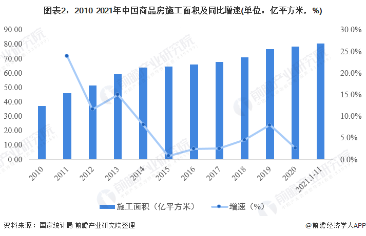 2021年1-11月,中国商品房施工面积为80.63亿平方米。其中,商品住宅施工面积同比增长6.5%;办公楼施工面积同比增长2.3%;商业营业用房施工面积同比下降1.9%。
