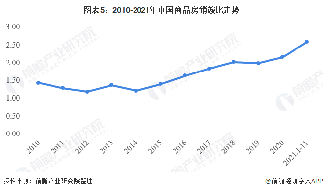 2010-2021年,中国商品房销竣比保持上升态势。2020年,中国商品房销竣比达到了2.16。2021年1-11月,中国商品房销竣比为2.58,相比2020年末上升了0.42。