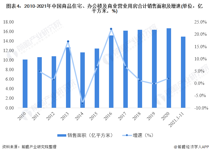 2021年1-11月,中国商品住宅、办公楼及商业营业用房三者合计销售面积为14.95亿平方千米,其中,商品住宅增长4.4%,办公楼增长2.0%,商业营业用房下降2.6%。