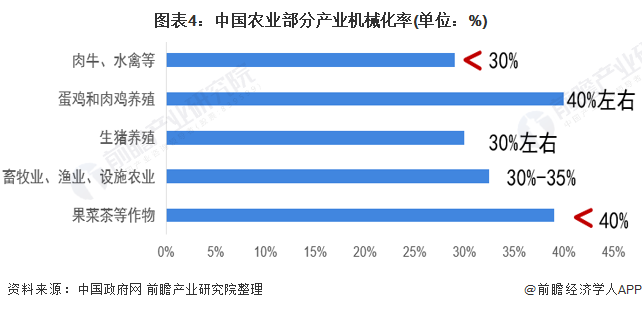 目前我国主要农作物耕种收综合机械化率超过70%,三大主粮生产已基本实现机械化,但农业的不同产业间、不同区域间机械化发展还很不平衡:果菜茶等作物的机械化率不到40%,畜牧业、渔业、设施农业等机械化率只有30%至35%。畜禽养殖以中小养殖场户为主体,其养殖量占比超过80%,但机械化程度低于30%,其中生猪养殖机械化水平在30%左右,蛋鸡和肉鸡养殖的机械化水平在40%左右,肉牛、水禽等机械化水平普遍低于30%。