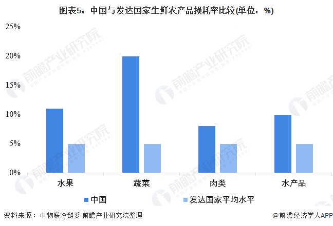 根据中物联冷链委发布的《2019农产品产地冷链研究报告》数据显示,目前欧美国家已经将生鲜产品的损耗率控制在5%的稳定水平,其他食品的损耗率也已经降到了1%以下,而我国的生鲜平均损耗率在10%以上,是欧美国家的2-3倍。