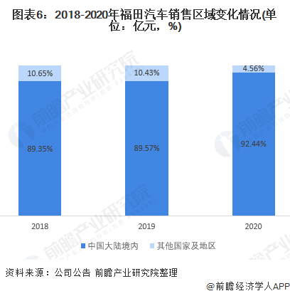 2018-2020年,福田汽车的主要销售区域为中国大陆。每年约有10%的销售额来自于海外市场,而2020年,全球均受到疫情影响,得益于中国大陆首先从疫情中恢复,市场需求大幅回升,中国大陆市场销售额增加约10个百分点;相反地,海外市场受到疫情影响较为严重,市场需求受挫严重,因此,海外市场占比大幅下降约6个百分点。