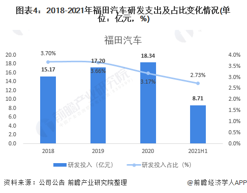 2018-2020年,公司的研发投入逐年上升而研发投入占比逐年下降。研发投入每年仍在增长,营业收入的增长幅度大于研发投入幅度。从一定程度上,福田汽车重视产品的研发和升级。