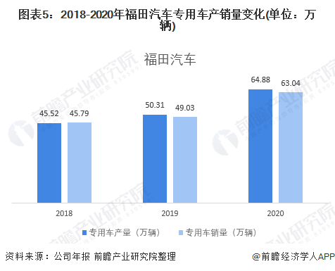 2018-2020年,福田汽车的产销量逐年上升。而2020年产销量大幅增长的主要原因是公司重点推广AMT自动挡产品,通过差异化的核心竞争优势进一步确立“高效、节油、舒适”的品牌形象,因此牵引车实现大幅增长,冷链、快递始终保持第一,提升了产品的销量及竞争力。