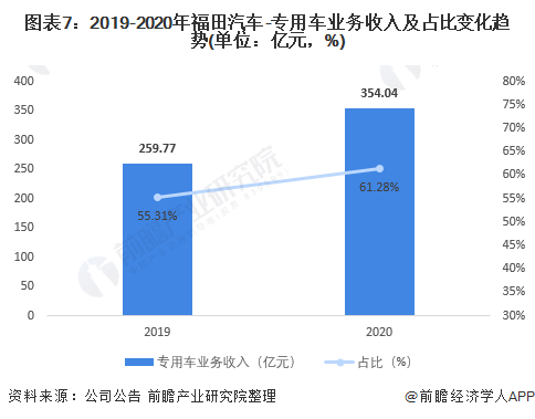 2019-2020年,专用车业务的营业收入和占比均大幅上升。福田汽车的专用车业务主要有两种产品,其一是轻卡,其二中重型卡车。