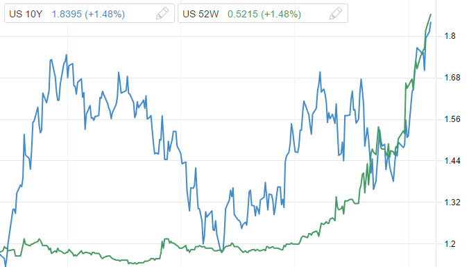 如上图所示,美国的十年期和一年期国债收益双双“争先恐后”的走高,这在2021年11月之前很少出现。美联储现行的基准利率为0~0.25%,而一年期债券收益率已经升至0.5215%,十年期更是高达1.8395%,市场已经开始对本年度预期三次的加息动作重新定价。利率升高会提振美元,但对美股来说是赤裸裸的利空。专业角度讲,股票的估值模型里,无风险利率是重要参与,其数值越大,则最终的折现价值越小,股票就倾向下跌;反之,则折现价值越大,股票就倾向上涨。通俗角度说,债券代表无风险收益,当其提高后,会分流一部分本来要流入股票市场的资金,所以股市会出现疲弱迹象。