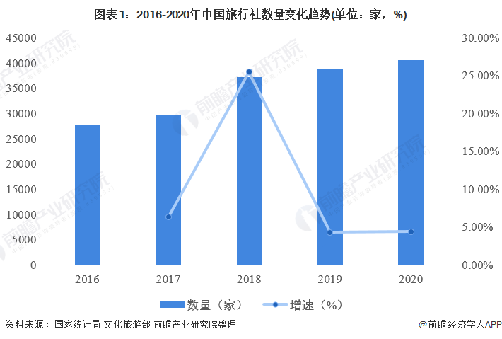2016-2020年,中国旅行社数量整体呈上升趋势。2020年全国旅行社总数为40682家(按2020年第四季度旅行社数量计算),比2019年增长4.47%。