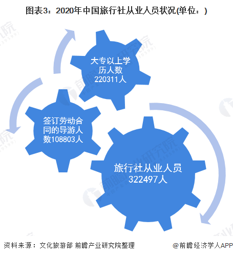 2020年,全国旅行社从业人员322497人,其中大专以上学历人数220311人,签订劳动合同的导游人数108803人。