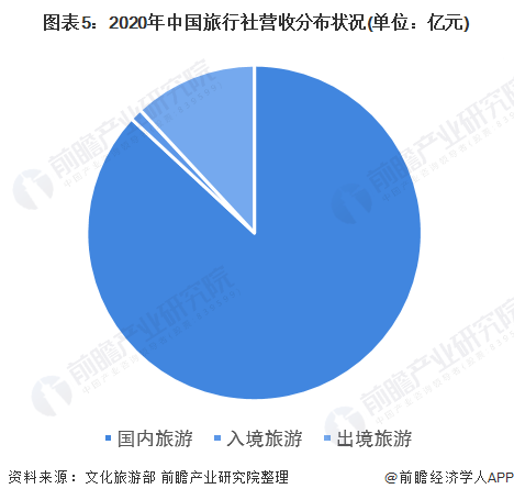 中国旅行社行业整体数量呈上升趋势,旅行以成为当代人重要的娱乐休闲方式,伴随“红色旅游”等旅行概念热度上升,作为连接游客与景区之间的旅行社起到了重要的桥梁作用。旅行社区域分布中,广东、北京、江苏等经济实力较强、旅游资源丰富的省市拥有旅行社数量更多。旅行社行业的发展也带动了数十万人的就业,为中国经济发展做出来重要贡献。2020年,全国旅行社营收超过2000亿元,但在疫情影响下,利润急剧下滑,整体有所亏损。随着疫情好转,压抑之后的旅行需求将为旅行社行业打上一级强心针,预计2021年旅行社行业盈利状况将有所好转。同样受制于全球疫情的影响,2020年,国内旅游占据了主要份额,占比达到了86.90%;出境旅游占比仅为11.92%,占比下降了29.62个百分点。